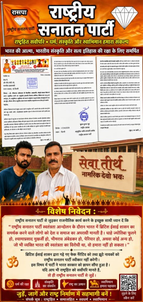 राष्ट्रीय सनातन पार्टी से जुडकर राजनीतिक कार्य करने के इच्छुक साथी ध्यान दें कि "राष्ट्रीय सनातन पार्टी स्वतंत्रता आन्दोलन के दौरान भारत में ब्रिटिश ईसाई शासन का समर्थक करने वाले लोगो को देश व समाज का अपराधी मानती है। चाहे ज्योतिबा फुल्ले हो, श्यामाप्रसाद मुखर्जी हो, भीमराव अंबेडकर हो, पेरियार हो, अथवा कोई अन्य हो, जो भी व्यक्ति भारत की स्वतंत्रता का विरोधी था, वो हमारा नहीं हो सकता।" ब्रिटिश ईसाई शासन द्वारा गढ़े गए फेक नैरेटिव को तथा झूठे नायकों को राष्ट्रीय सनातन पार्टी स्वीकार नहीं करेगी। इस विषय में पार्टी ने भारत सरकार को ज्ञापन सौंपा हुआ है। यदि आप भी राष्ट्रहित को सर्वोपरि मानते है, तो ही राष्ट्रीय सनातन पार्टी से जुड़े। राष्ट्रीय सनातन पार्टी से जुड़कर कार्य करने के लिए हमसे 9410073474 पर वाट्सऐप द्वारा संपर्क करें।